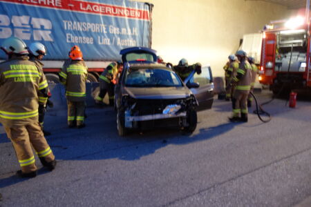 Ein PKW prallte in die Betonleitwand und kam auf der Straße zum Stillstand. Die Kameraden der FF Langwies und der FF Ebensee führten die Aufräumarbeiten am Unfallort durch.